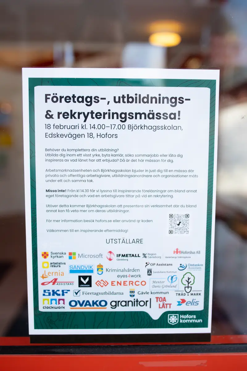 Den 18 februari deltog vi på företags-, utbildnings- och rekryteringsmässan i Björkhagsskolan i Hofors. Mässan samlade företag, utbildningsaktörer och besökare från hela regionen som ville utforska olika vägar för utveckling, karriärsteg och stärkt kompetens i arbetslivet.